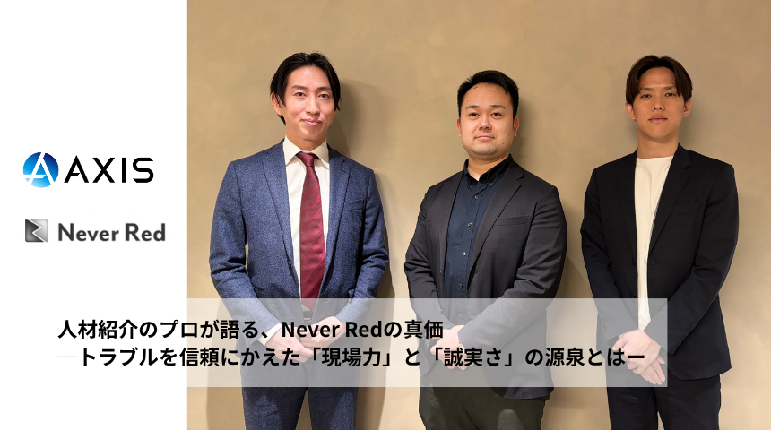 アクシスコンサルティング株式会社の本部長・大森氏、営業担当・三木氏と、弊社代表・浅香による、プロの視点から見たNever Redの価値と今後の展望についての対談インタビューです。